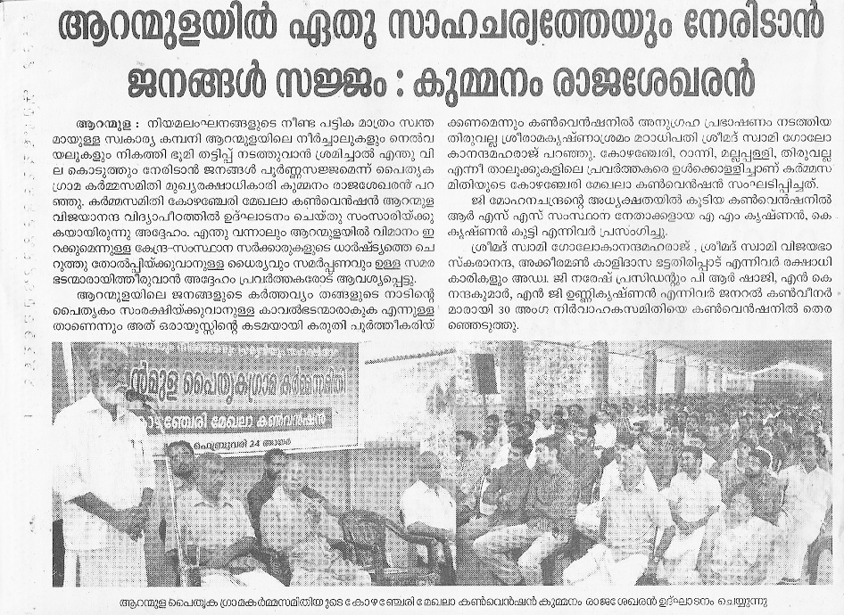Kummanam had locked horns with those who were so powerful to get it declared that the airport would be built at Aranmula in the President’s policy declaration despite clearly showing that construction of the airport would cause severe environmental damage and that it involved blatant violation of Paddy and Wetland Protection Act, Environmental Protection Act and the Land Reforms Act. By constantly reminding the need for the heritage village called Aranmula to be protected; the fields, ponds and the hills to be protected, the struggle that Kummanam led was one that mobilized poets and literateurs across religious, caste, political differences. Finally, financially and politically powerful businessmen realized that they could not even land a helicopter in Aranmula by ignoring this man.When the state government submitted an affidavit in the court that the approval given to Aranmula airport and declaration of the industrial zone was withdrawn, the thousands who rallied behind Kummanam Rajasekharan's unwavering steps were happy and relieved. Aranmula was the victory of a brilliant popular struggle that Kerala had seen.It was the legendary popular struggle led by Kummanam byent wining cultural leaders including Sugathakumari, Sangh Parivar organizations and political parties including CPM, CPI and BJP in a single thread that overcame the forces of power and wealth and put an end to the airport project.